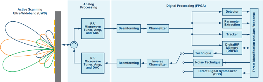 电子支援系统用于拦截和测量信号参数,以识别信号源并进行威胁分析。电子攻击系统会产生干扰信号,以压制真实脉冲。数字射频存储器(DRFM)是一种用于欺骗雷达的欺骗技术。电子保护系统主要用于处理和存储输入信号以构建信号数据库。该数据库是一个持续更新的查询表,用于识别未来雷达系统。传统上,这些系统是在模拟平台上开发的。现代系统的数字化水平更高,可以利用可编程逻辑器件强大的信号处理能力。