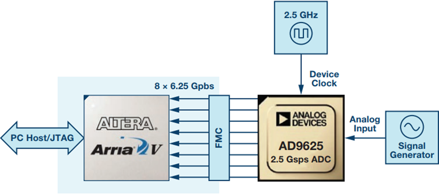 图5A. AD9625通过JESD204B接口连接Altera Arria V