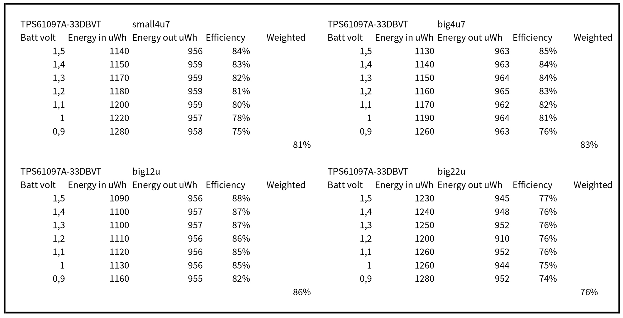 对于图 1 所示设置,DUT 每 30 秒测量一次温度、湿度和光照,使用 10 个这样的周期求取均值。总效率值是通过加权电池将保持在既定电压电平的时间来计算,参见图 2,其中,电池估计会在 9% 的时间处于 1.5 V 电压,8% 时间处于 1.4 V 电压,等等。这不完全正确,但对这个案例来讲是适当的估计。