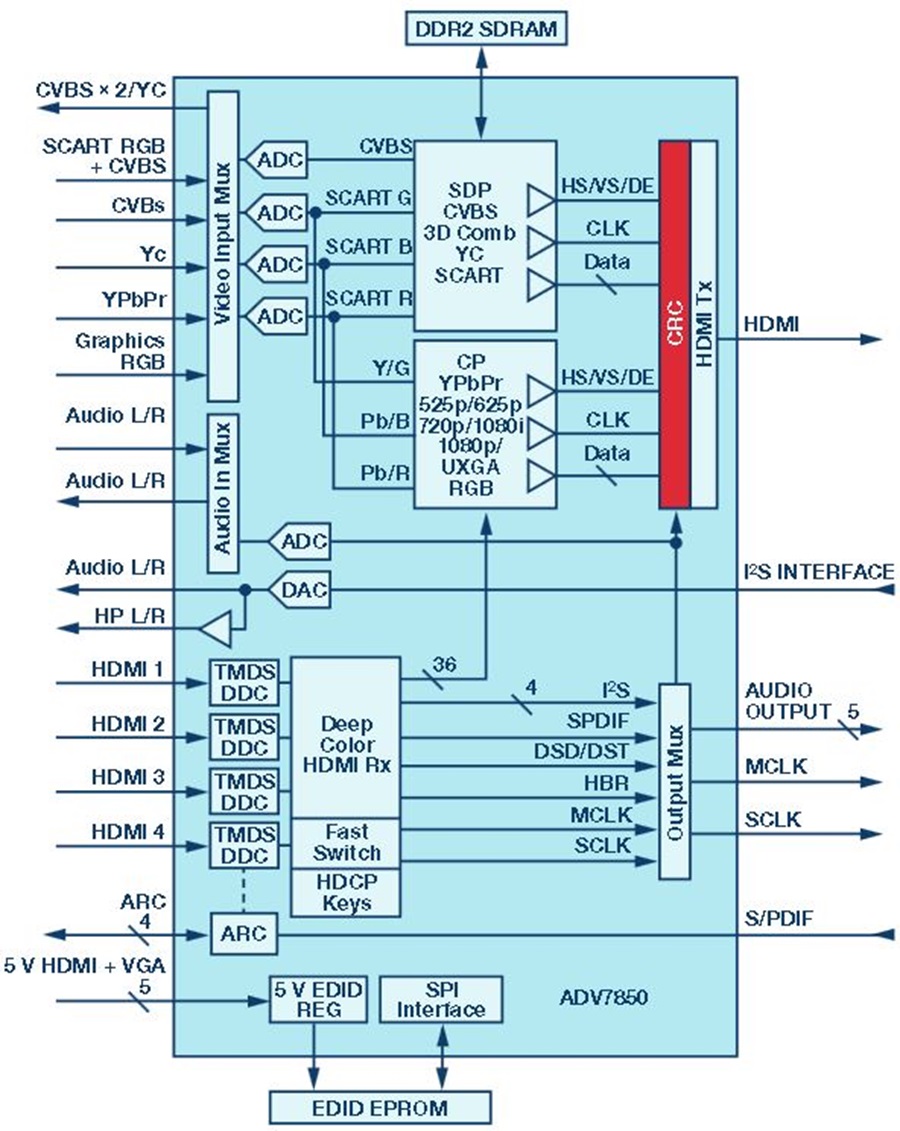 图3. ADV7850功能框图突出显示了CRC模块的位置。