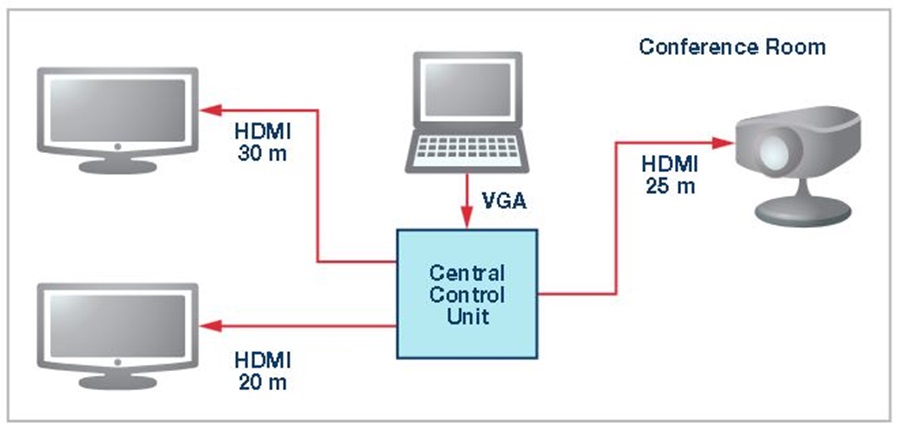 例如,在视频会议系统中,视频可以通过一系列最长30米的HDMI电缆从中央控制台到房间的周围路由到多台监视器或投影仪(参见图6)。然而,如此长的HDMI电缆可能是系统成本的重要组成部分,价格从几十美元到几百美元不等。视频产品设计师和制造商可以选择评估来自低,中和高成本供应商的电缆。电缆供应商通常可以通过电缆质量来证明其制造成本。但是,视频产品设计和制造商必须在选择与产品一起提供的电缆的质量和成本之间取得平衡。