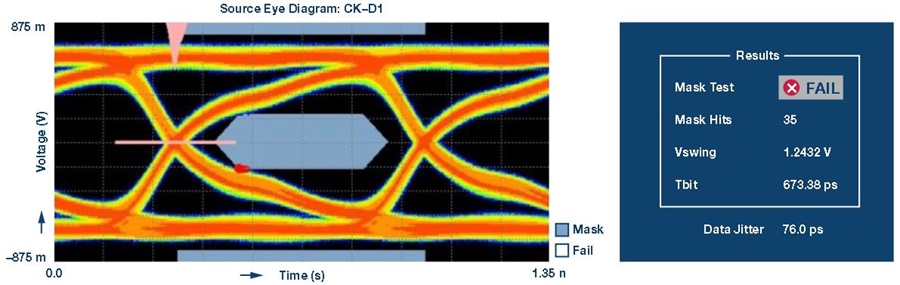 框架检查器的另一种可能用途是评估在硬件更改最少的情况下扩展产品规格的影响。典型的调查如下:视频产品设计和制造商当前正在使用已知的优质电缆,该电缆具有系统特征,并提供合理且值得信赖的性能。从电缆接收的数据质量下降到在1080p时略微影响HDMI一致性测试规范的抖动容限模板的程度,但不会导致ADV7850恢复数据时出现任何问题(见图7)3。使用帧检查器,可以以自动化的方式将电缆的性能基准化到特定水平—测试可以进行数千次迭代,并记录结果。