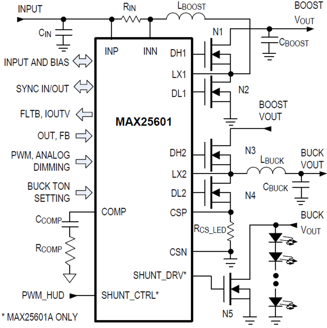 Maxim MAX25601A/MAX25601B/MAX25601C/MAX25601D同步升压/-降压控制器是后跟同步降压LED控制器的同步升压控制器。该升压控制器具有4.5V至40V输入电压范围,非常适合用于汽车应用,并可用作第二级降压LED控制器的预升压电源。该同步升压器是一种电流模式控制器,可以与另一个器件并联以提供更高的输出功率。SYNC OUT引脚提供时钟来驱动另一器件的RT/SYNC IN引脚,从而实现两相180度异相操作。该升压转换器经设置可实现200kHz至2.2MHz的开关频率。该器件具有扩频功能以降低EMI。该器件具有内部数字软启动特性,以实现升压输出的平滑上电。该器件具有断续模式、过压保护和热关断等保护特性。
