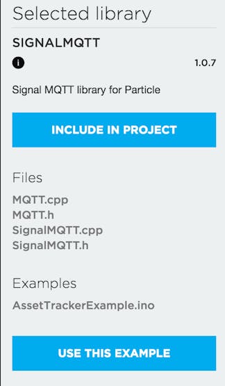 在 Particle 的 IDE 中,单击库图标并搜索SignalMQTT 。一旦您选择了SignalMQTT库(在撰写本文时,该库的版本为 1.0.7),您将找到一个名为AssetTrackerExample.ino的示例应用程序。选择该文件并单击使用此示例按钮。这将为您创建一个新应用程序。
