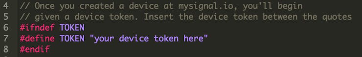 您需要在此文件中更改以使其工作的唯一内容是第 7 行的 TOKEN。您需要将之前从MySignal.io收到的设备令牌粘贴在引号之间。