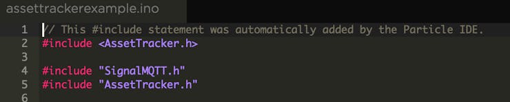 默认情况下,Particle IDE 将自动在代码的最顶部添加资产跟踪器库的#include 语句,但AssetTrackerExample.ino已经包含它。它不应该引起任何问题,但是可以删除两行之一。