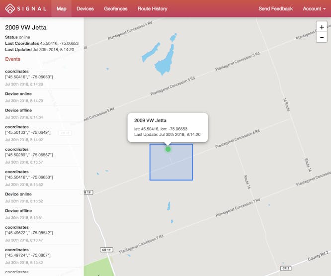 一旦您的资产跟踪器具有蜂窝连接和 GPS 定位,它会将坐标提交到MySignal.io ,您应该会在地图上实时看到您的资产。