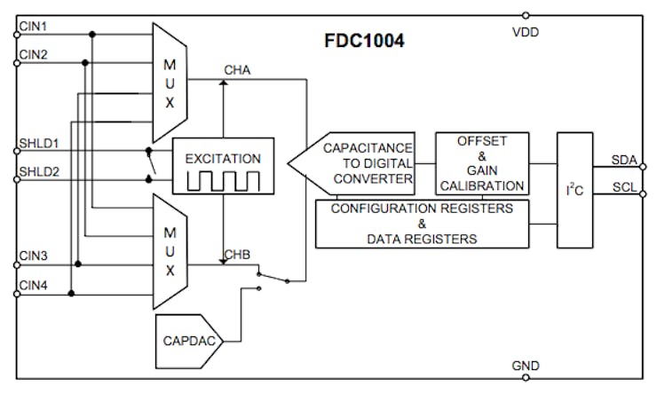 TI FDC1004 是一款将电容测量和 ADC 集成在一个封装中的一体化芯片,称之为“电容数字转换器”。指定的应用包括接近检测、手势识别和液位传感。