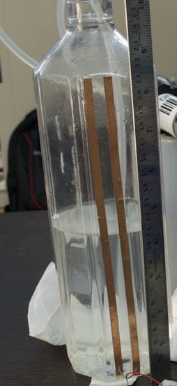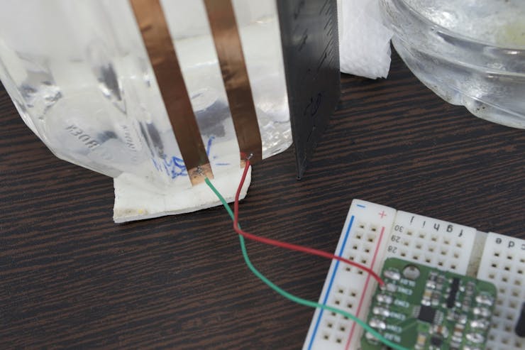 实际应用是一个更大的设置,但为了本文,我们在一个小水瓶上演示了相同的设置。我们粘贴了两条从Sparkfun购买的薄铜带(5 毫米宽)。