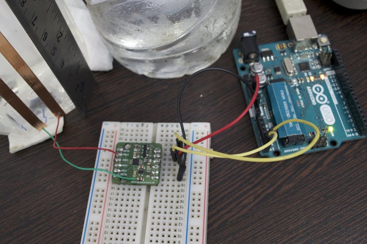 在这个例子中,我们刚刚将电容到水平高度转换硬编码到 Arduino 代码本身,但是,校准可用于为各种高度和液体类型设置相同的值。