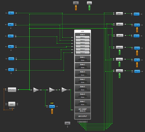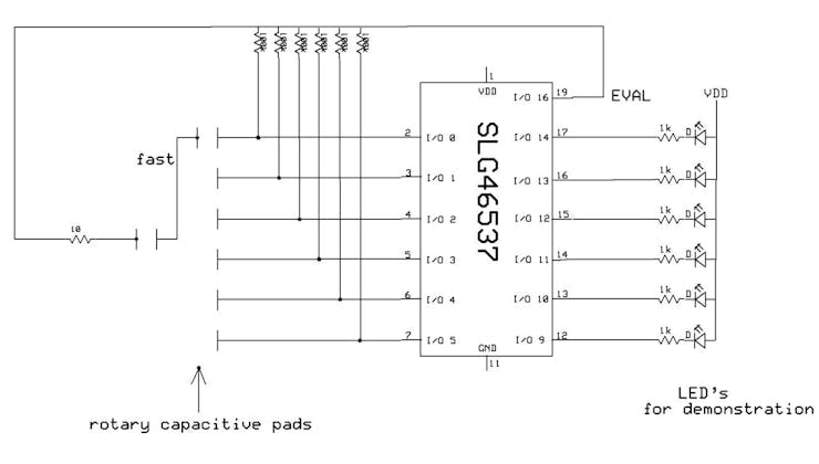 该GreenPAK SLG46537 :该IC提供了所有为这个设计的电路功能。它生成一个信号 (EVAL) 以改善信噪比,从旋转开关的每个扇区焊盘接收输入,并使用异步状态机 (ASM) 解释每个扇区焊盘以保证只有一个开关选择。