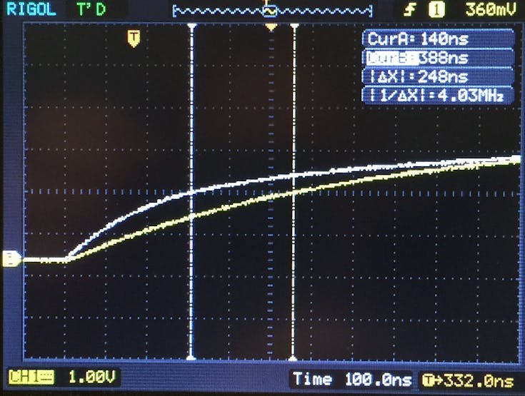 图 2 是示波器捕获,显示了选择器滑动器与其对齐的扇区焊盘的上升时间与其他未选择焊盘的上升时间的差异。delta T 为 248 nS,对于 GreenPAK 异步状态机 (ASM) 解决来说,这绰绰有余。ASM 可以在一纳秒内解决,其内部仲裁电路保证只有一种状态有效。因此,任何时候只有一个输出会注册。
