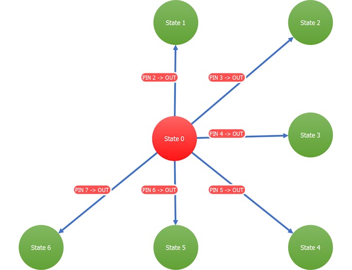 一个稍微延迟的 EVAL 副本用作每个周期的 ASM 复位。这确保我们总是从 STATE0 开始。在 ASM 复位条件之后,每个焊盘上的 ASM 都会监控 EVAL 信号。只有最早的上升沿才会导致状态从 STATE0 跳出。来自其他焊盘的任何后续上升沿都将被忽略,因为只有一种状态转换是可能的。这也是因为我们配置 ASM 的方式如图 6 所示。 6 个 ASM 输出状态中的每一个都只对应一个扇区焊盘。