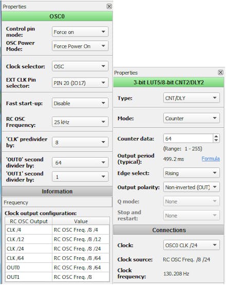 为了节省功耗,EVAL 信号以适合应用响应时间的速率生成。使用低频振荡器并与 CNT2 进一步分频。在这个例子中,它大约是 16 Hz。请参见图 4 中的配置设置。