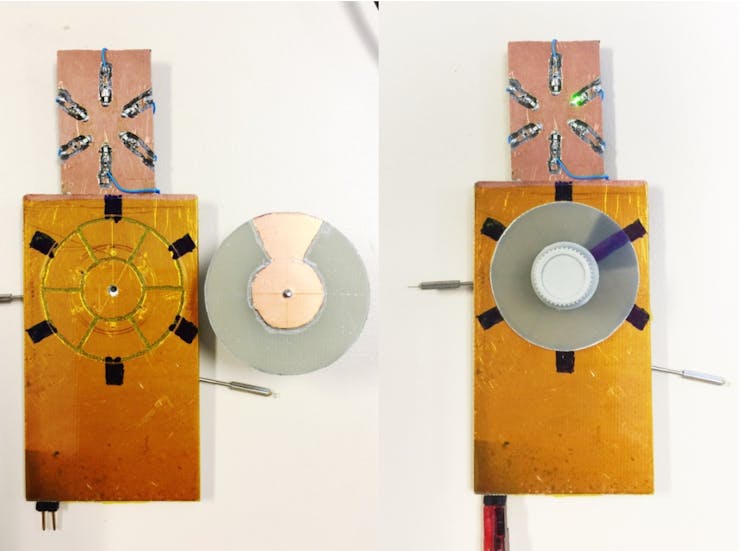 焊盘和擦拭器的布局最大化以获得最强信号。发现该原型不受强射频干扰的影响,例如大型荧光灯泡和 5 W 145 MHz 无线电。这可能是因为所有焊盘都受到共模干扰。