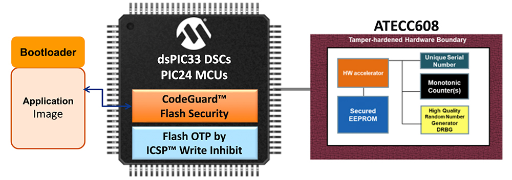图 6:ATECC608 或 TA100 等安全 IC 补充了 dsPIC33C DSC 和 PIC24F MCU 的安全功能,简化了安全嵌入式系统的实施。(图片来源:Microchip Technology)