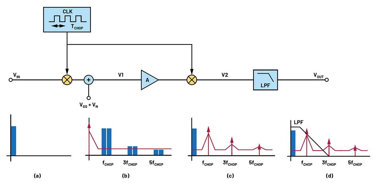 频域分析也有指导意义(图 3)。输入信号 (a) 被调制到斩波频率 (b),在 f斩波的增益级经过处理,在输出端解调回直流 (c),最后通过 LPF (d)。放大器的偏移和噪声源(红色信号)通过增益级进行直流处理,通过输出斩波开关 (c) 调制到 f 斩波 ,最后由 LPF (d) 滤波。由于采用方波调制,因此约在调制频率的奇数倍进行调制。