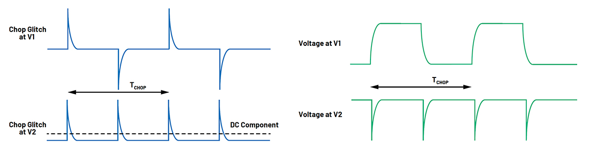图 6:V1(斩波开关内)和 V2(斩波开关外)处电荷注入产生的毛刺电压(左图);V1 和 V2 的有限放大器带宽引起的毛刺(右图)。(图片来源:Analog Devices)