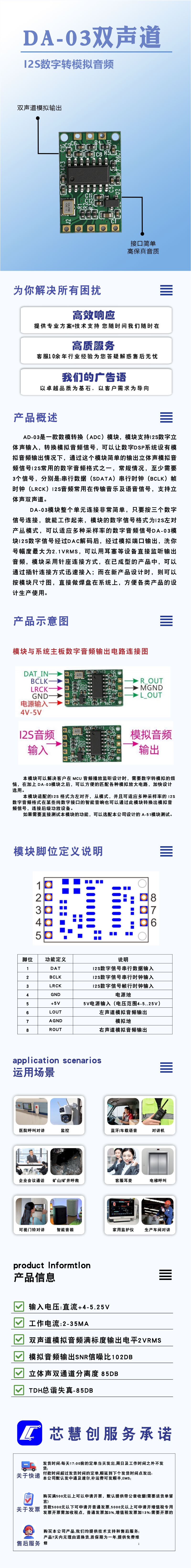 DA-03 模组以 “高品质、易集成、广适配” 为核心,为数字音频设备提供从数字到模拟的无缝转换方案,无论是升级现有产品音质,还是开发新型音频终端,都能显著降低设计难度与成本,助力打造更具竞争力的音频产品。